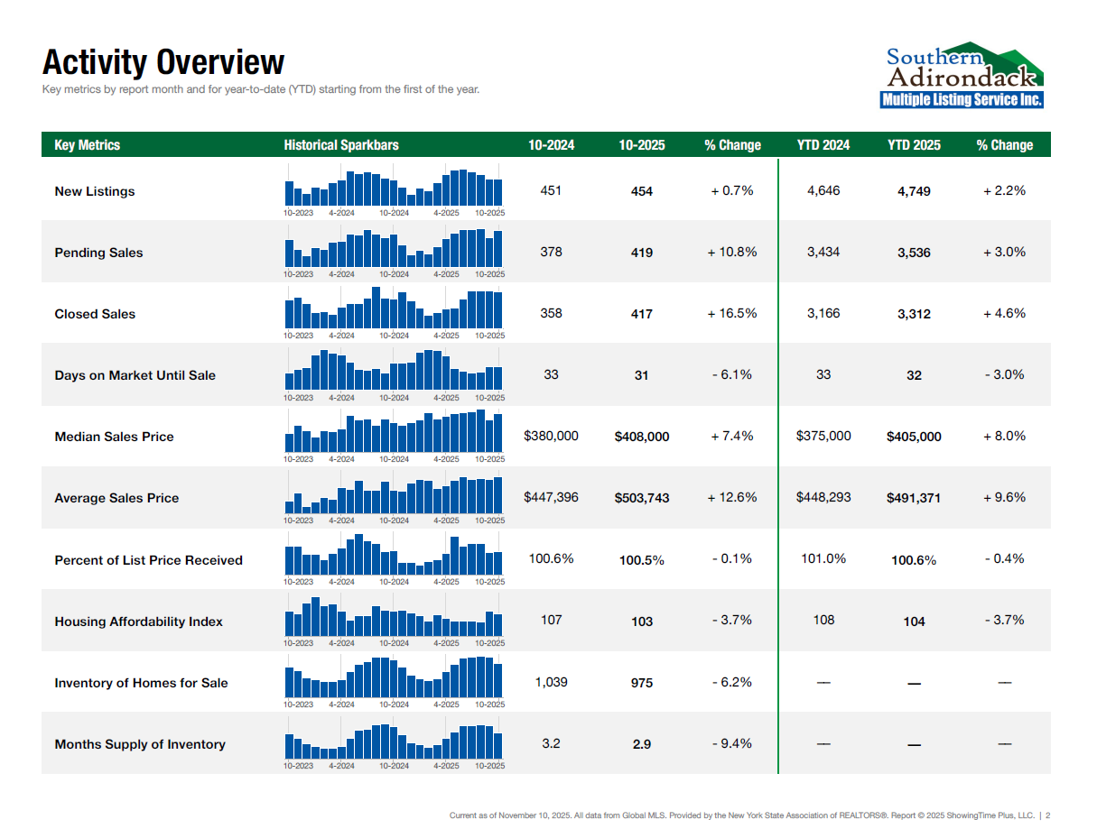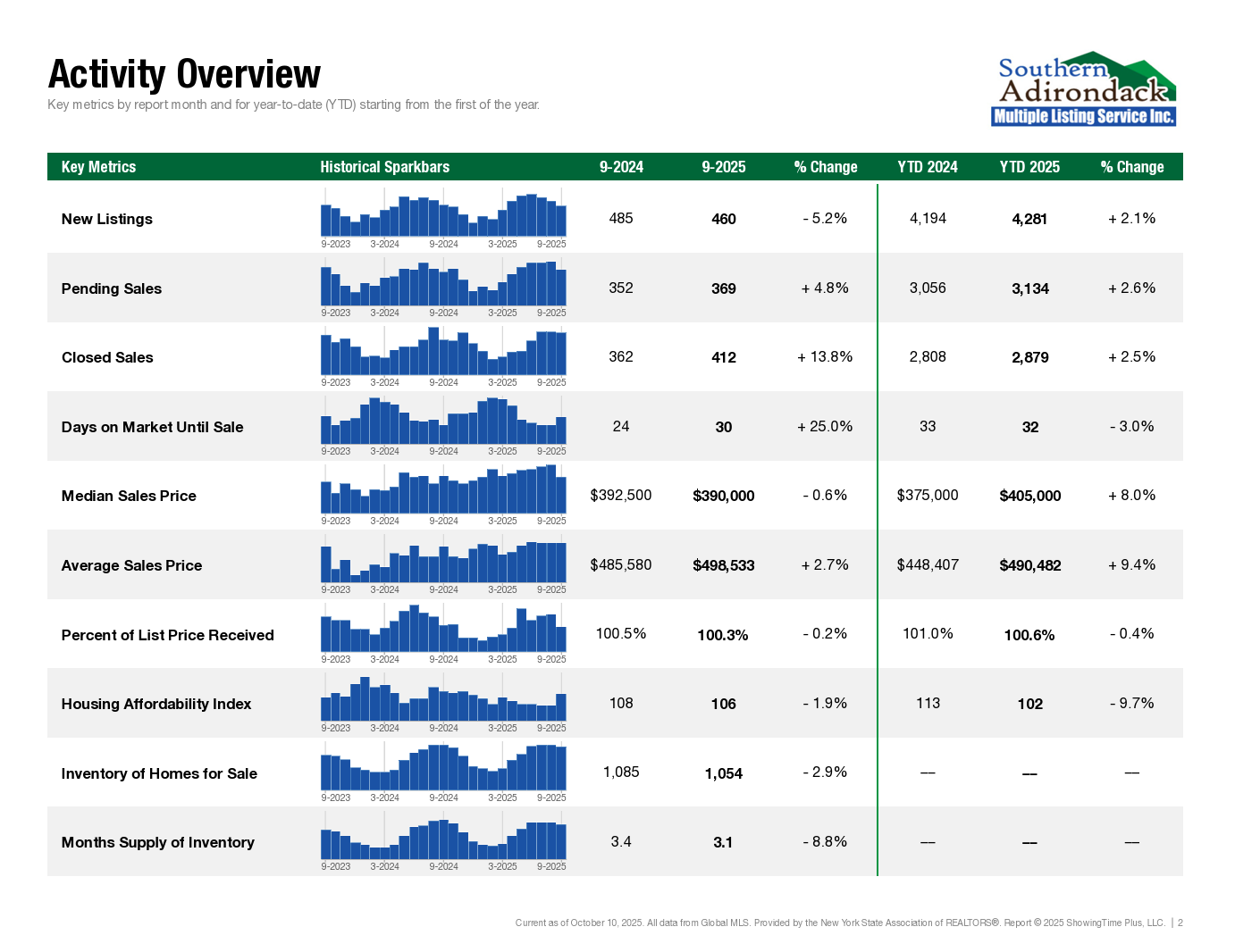 Residential activity in the counties of Essex, Hamilton, Saratoga, Warren, and Washington is composed of single-family properties, townhomes, and condominiums combined. Percent changes are calculated using rounded figures.