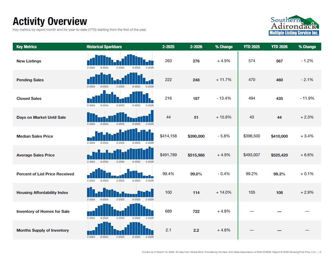 Residential activity in the counties of Essex, Hamilton, Saratoga, Warren, and Washington is composed of single-family properties, townhomes, and condominiums combined. Percent changes are calculated using rounded figures.